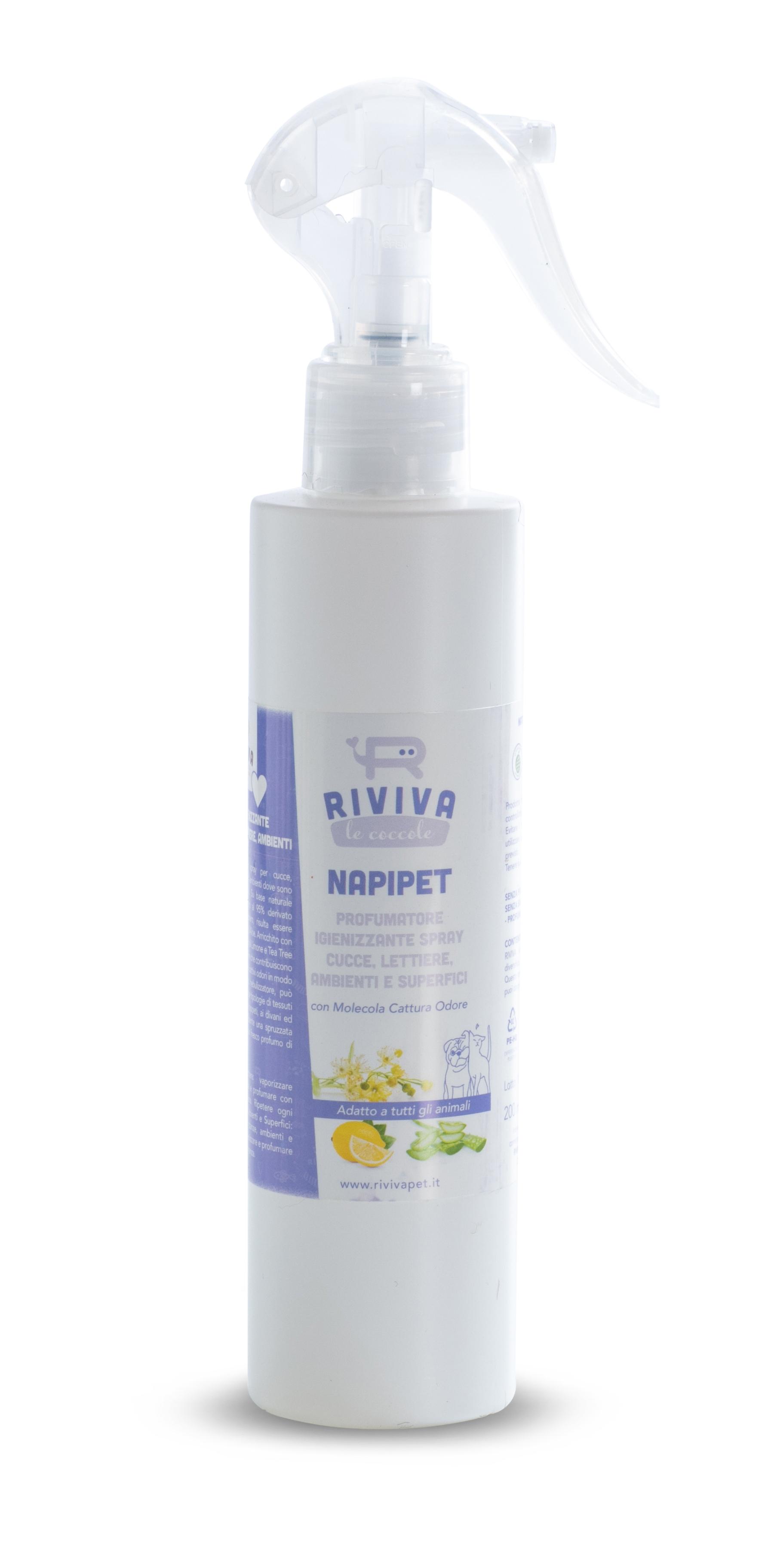 Napipet di RIVIVA è un profumatore igienizzante spray per cucce, lettiere, tessuti, superfici e ambienti dove sono presenti animali domestici. Formulato con il 70% di alcool puro al 95% derivato da barbabietola da zucchero piacevolmente profumato di Aloe.